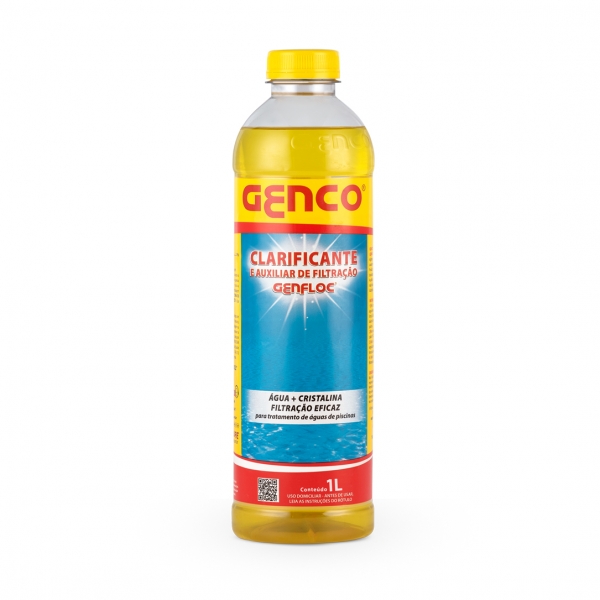 Clarificante e auxiliar de filtração genfloc é um eficiente clarificante e auxiliar de filtração para águas de piscinas. Sua ação floculante atrai eletrostaticamente as partículas de sujeira que normalmente passariam pelo meio filtrante e forma com elas flóculos grandes que o filtro passa a reter. Isso aumenta o rendimento do filtro. Os flocos maiores e mais pesados decantam para o fundo da piscina de onde podem ser aspirados normalmente. O resultado é a clarificação completa da água.